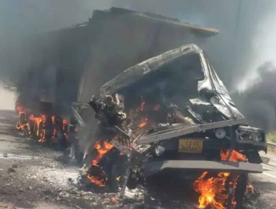 टक्कर के बाद ट्राला में लगी भीषण आग
