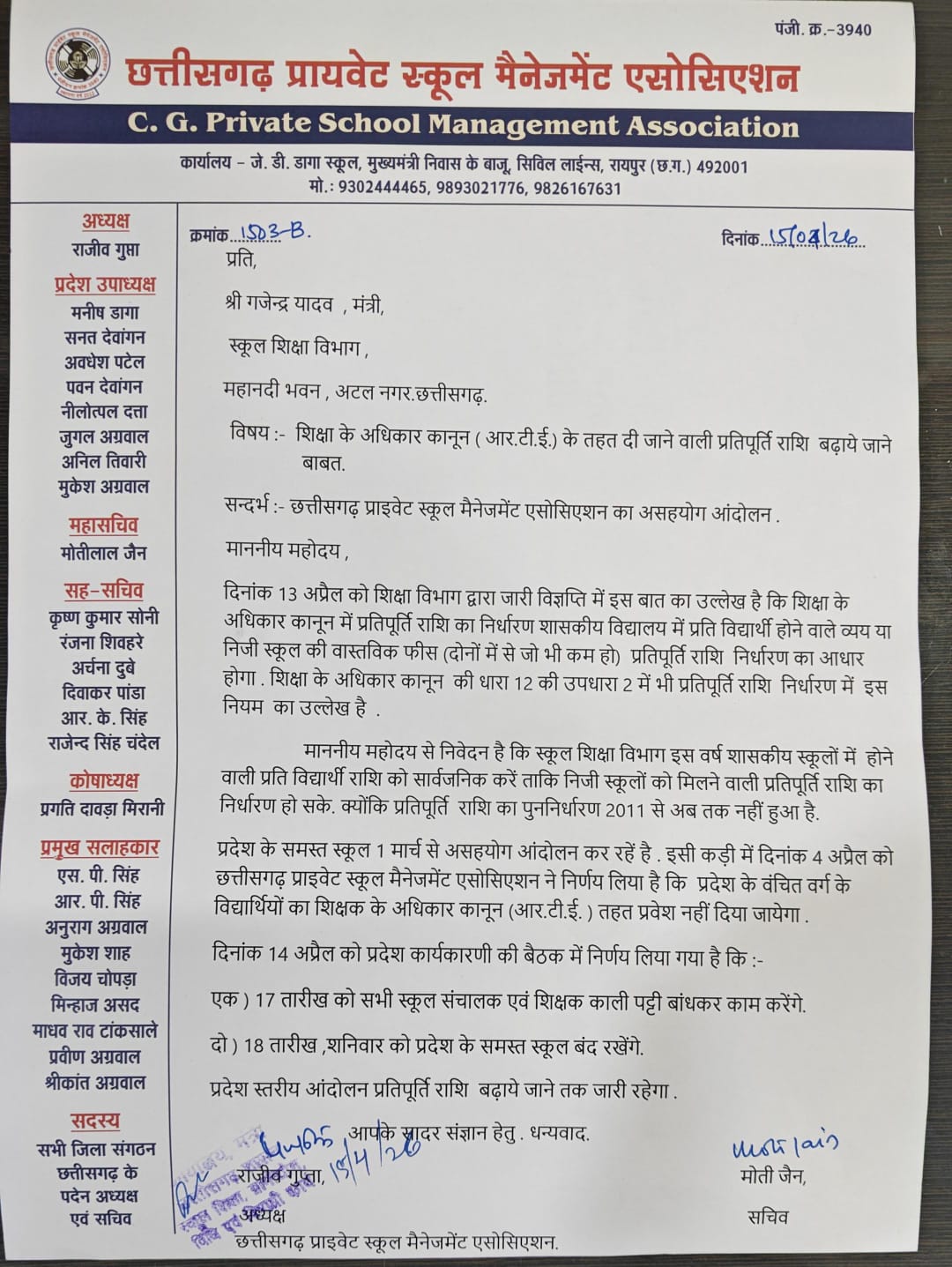 धन्यवाद. राजीव गुप्ता, मोती जैन, अध्यक्ष, सचिव,छत्तीसगढ़ प्राइवेट स्कूल मैनेजमेंट एसोसिएशन.